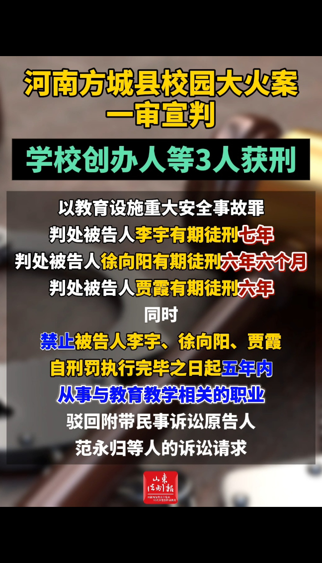 2025年12月19日,河南省方城县人民法院一审公开审理被告人李宇、徐向阳、贾霞涉嫌犯教育设施重大安全事故罪及附带民事诉讼原告人范永归等人提起刑事附带民事诉讼一案,并当庭宣判,以教育设施重大安全事故罪,判处被告人李宇有期徒刑七年,判处被告人徐向阳有期徒刑六年六个月,判处被告人贾霞有期徒刑六年;同时,禁止被告人李宇、徐向阳、贾霞自刑罚执行完毕之日起五年内从事与教育教学相关的职业;驳回附带民事诉讼原告人范永归等人的诉讼请求。