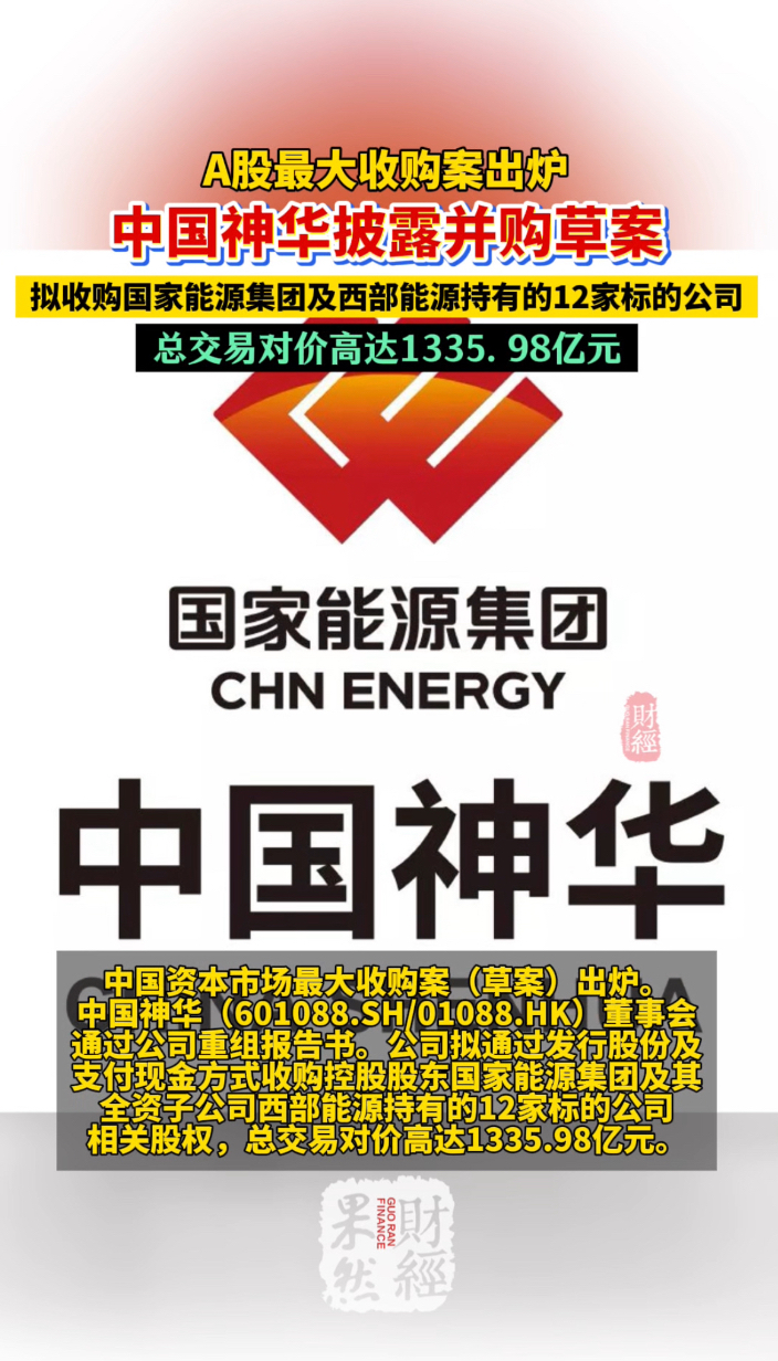 果然财经 | A股最大收购案出炉!中国神华披露并购草案齐鲁晚报·齐鲁壹点客户端 16:04原创中国资本市场最大收购案(草案)出炉。中国神华(601088.SH/01088.HK)董事会通过公司重组报告书。公司拟通过发行股份及支付现金方式收购控股股东国家能源集团及其全资子公司西部能源持有的12家标的公司相关股权,总交易对价高达1335.98亿元。