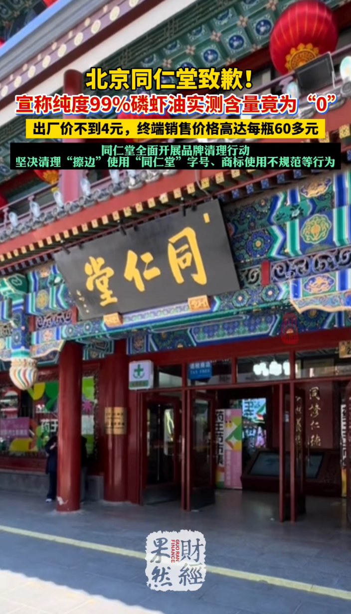 果然财经 | 宣称高纯度磷虾油实测含量竟为零!北京同仁堂致歉齐鲁晚报·齐鲁壹点客户端 16:04原创近日,市场上一款标称“北京同仁堂99%高纯南极磷虾油”的产品,宣称磷脂含量43%,实测结果却为0,被上海市消保委点名,引发社会关注。今天(20日),针对“南极磷虾油”事件,北京同仁堂发布声明并致歉。
