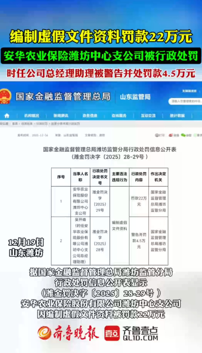 果然视频|因编制虚假文件资料,安华农业保险潍坊中心支公司被罚齐鲁晚报·齐鲁壹点客户端 18:44原创12月16日,国家金融监督管理总局潍坊监管分局发布行政处罚信息公开表(潍金罚决字〔2025〕28-29号 ),公开表显示安华农业保险股份有限公司潍坊中心支公司因编制虚假文件资料被罚款22万元 。同时,时任安华农业保险股份有限公司潍坊中心支公司总经理助理吴开峰因编制虚假文件资料,被警告并罚款4.5万元。 齐鲁晚报·齐鲁壹点 李国栋