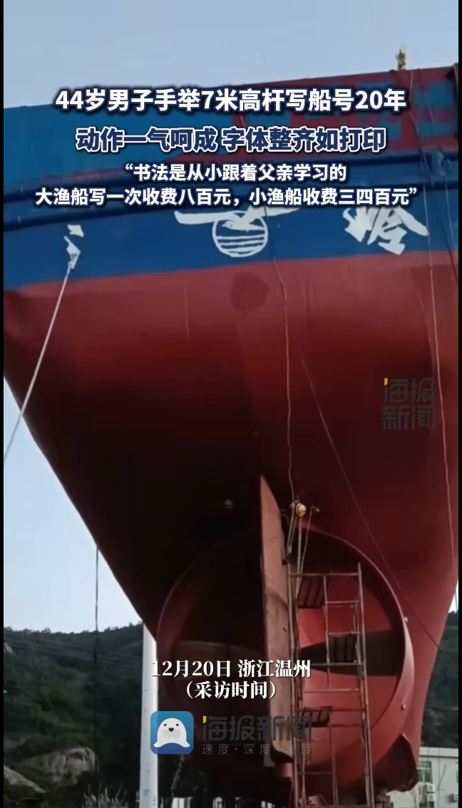 44岁男子手举7米高杆写船号20年:书法是跟父亲学习的,大渔船写一次收费八百元