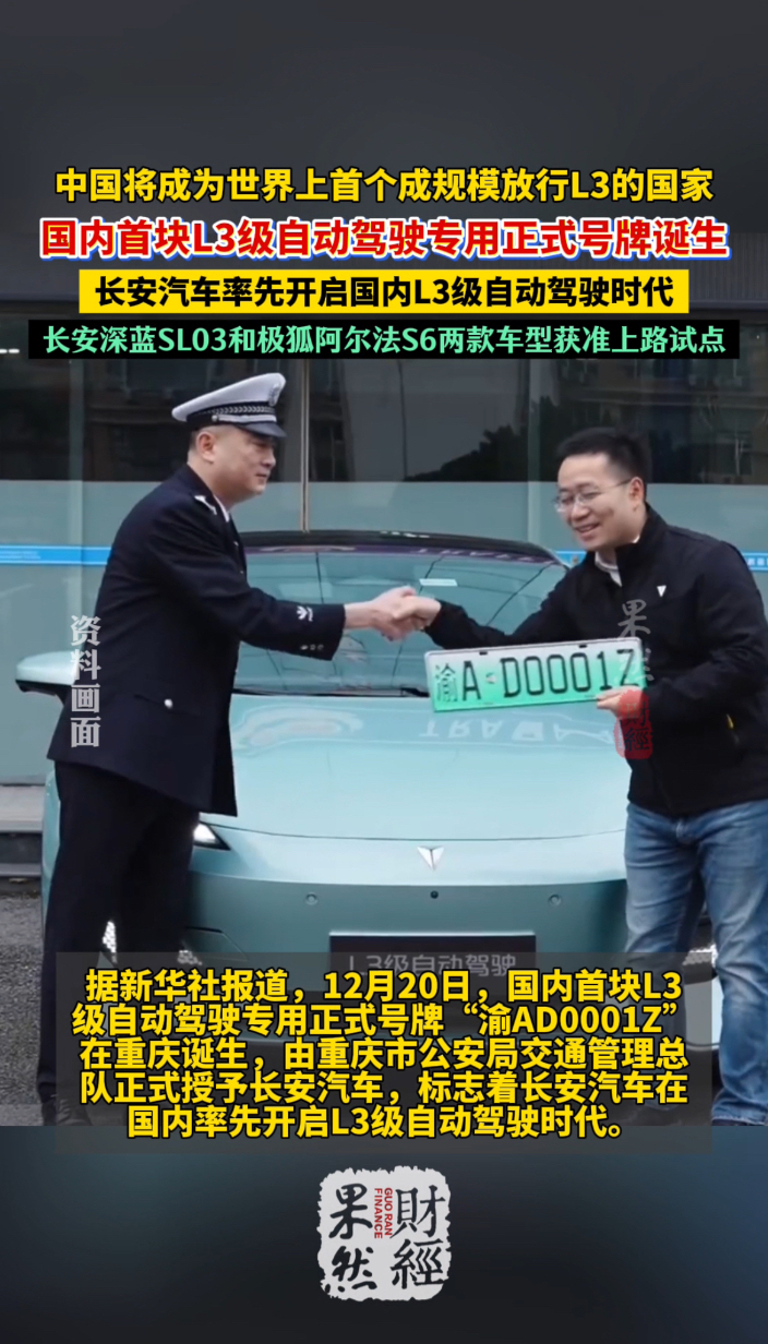 果然财经 |划时代! 国内首块L3级自动驾驶专用正式号牌诞生齐鲁晚报·齐鲁壹点客户端 昨天15:48原创据新华社报道,12月20日,国内首块L3级自动驾驶专用正式号牌“渝AD0001Z”在重庆诞生,由重庆市公安局交通管理总队正式授予长安汽车,标志着长安汽车在国内率先开启L3级自动驾驶时代。