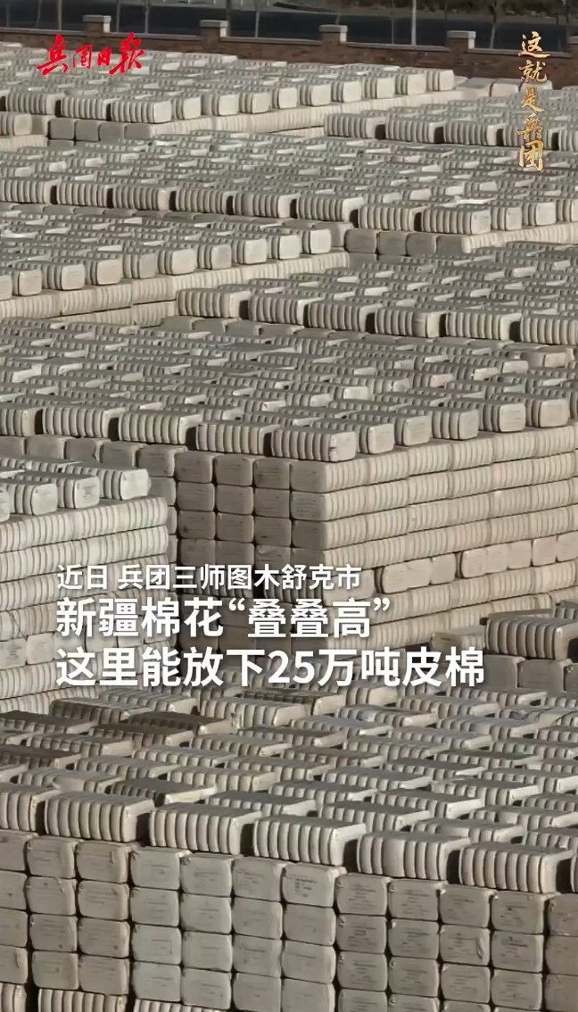 好壮观!新疆棉花上演 “叠叠高”兵团日报 10:26近日,兵团三师图木舒克市的棉花仓库里,新疆棉花正上演 “叠叠高”,这里可容纳25万吨皮棉。运载新棉的货车陆续驶入库区,工人们用叉车卸下皮棉,将其堆叠成规整的方块。