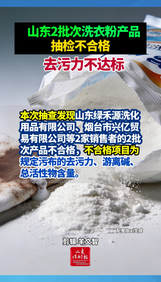 去污力不达标!山东2批次洗衣粉产品抽检不合格 20:39 原创大众新闻·山东法制报 微信扫码扫码下载客户端12月13日,山东省市场监管局发布2025年洗衣粉产品质量省级监督抽查结果。本次抽查发现山东绿禾源洗化用品有限公司、烟台市兴亿贸易有限公司等2家销售者的2批次产品不合格,不合格项目为规定污布的去污力、游离碱、总活性物含量。在洗衣粉中,去污力是产品使用性能主要评价指标,直观体现洗衣粉的实际使用效果。(大众新闻•山东法制报记者 羊文智)