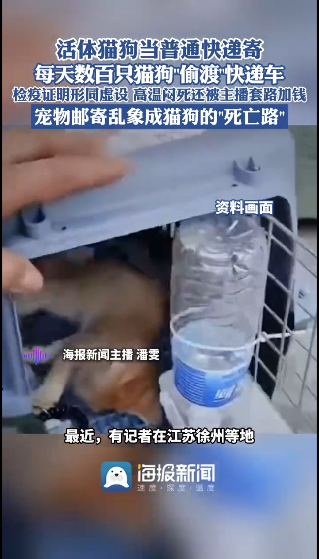 最近,有记者在江苏徐州等地暗访发现,当地每天都有几百只猫狗被塞进快递车,和其它货物混在一起发往全国。更让人揪心的是,运送过程根本不需要检疫证明,寄件人信息也可以随便填。密闭车厢遇上高温或寒冷天气,很多小动物根本撑不过长途颠簸。