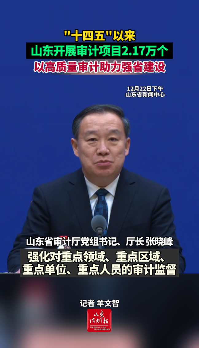 “十四五”以来,山东开展审计项目2.17万个,以高质量审计助力强省建设 20:37 现场大众新闻·山东法制报 微信扫码扫码下载客户端12月22日下午,山东省政府新闻办举行新闻发布会,介绍“十四五”时期山东推动审计事业高质量发展助力强省建设情况。山东省审计厅党组书记、厅长张晓峰会上介绍,十四五”以来,山东各级审计机关强化对重点区域、重点领域、重点单位、重点人员的审计监督,共开展审计项目2.17万个,在促进政令畅通、全面深化改革、维护经济安全、推进廉政建设等方面发挥了重要作用。