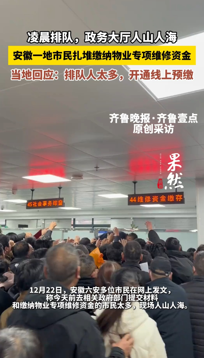 果然视频|政务大厅人山人海!安徽一地市民扎堆缴纳物业专项维修资金齐鲁晚报·齐鲁壹点客户端 昨天22:45原创12月22日,安徽六安多位市民在网上发文,称今天前去相关政府部门提交材料和缴纳物业专项维修资金的市民太多,现场人山人海。视频显示,今天凌晨天色尚黑的时候,就有很多市民来到相关政府部门大厅内排队,天亮后大厅内更是挤满了前来办理业务的市民。 (齐鲁晚报·齐鲁壹点记者 袁野 朱洪蕾)