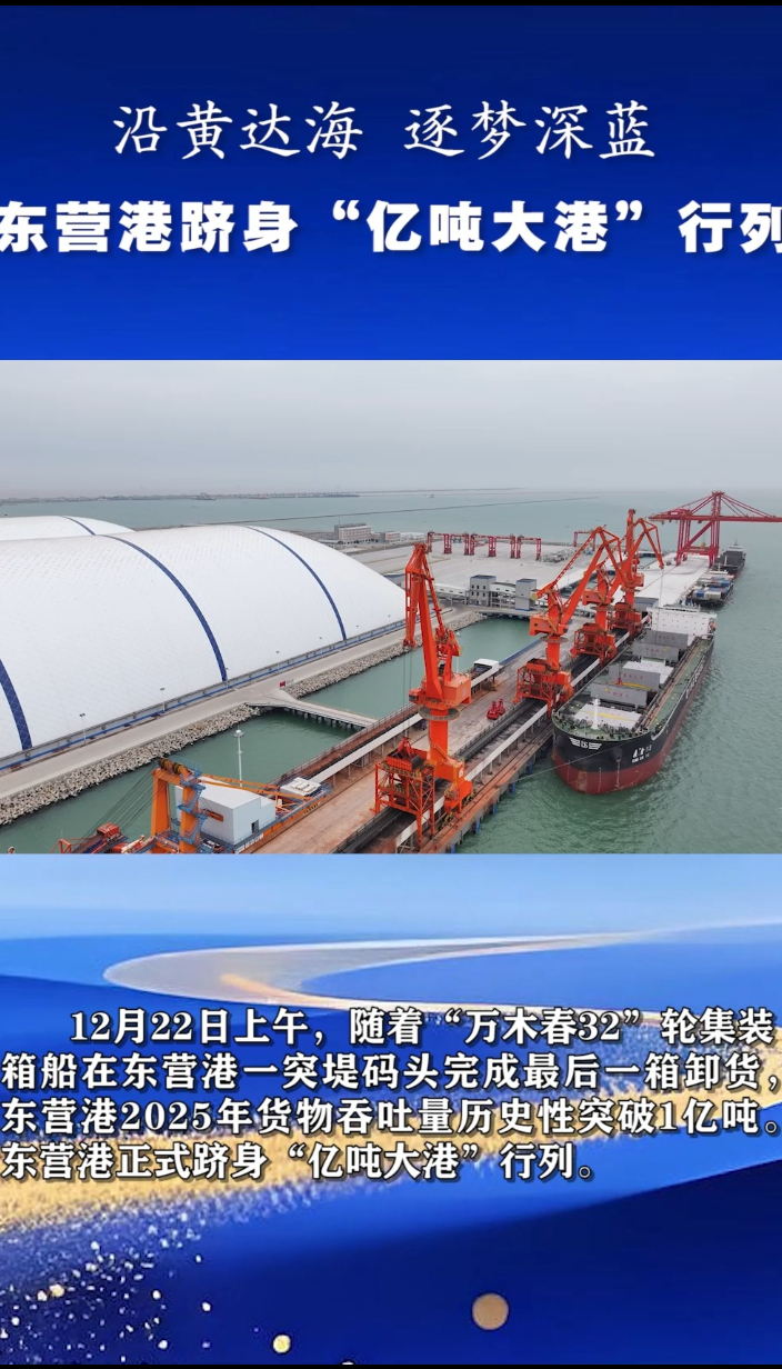 东营港跻身“亿吨大港”行列齐鲁晚报·齐鲁壹点客户端 昨天23:02原创12月22日上午,随着“万木春32”轮集装箱船在东营港一突堤码头完成最后一箱卸货,东营港2025年货物吞吐量突破1亿吨。这标志着东营港成功跻身“亿吨大港”行列,开启了向海图强新篇章。(大众新闻记者 赵士伟)