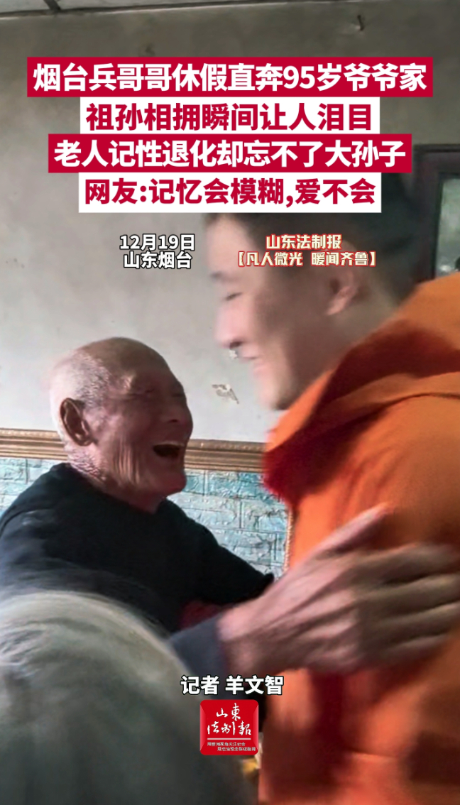 烟台兵哥哥休假直奔95岁爷爷家,祖孙相拥瞬间让人泪目,老人记性退化却忘不了大孙子 15:32 现场大众新闻·山东法制报 微信扫码扫码下载客户端12月19日,烟台招远籍军人袁先生休假归乡,迫不及待直奔95岁爷爷家中。祖孙俩相拥的瞬间,满是久别重逢的动容。老人虽已记忆力退化,却忘不了自己的大孙子。(大众新闻•山东法制报记者 羊文智)