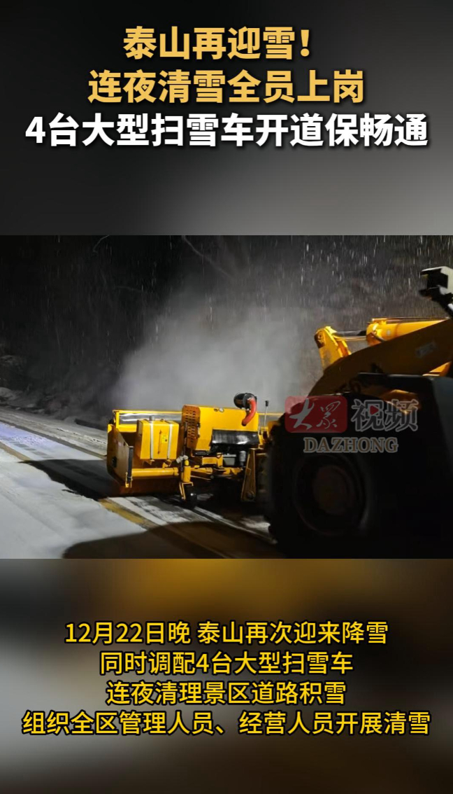 12月22日晚,泰山再次迎来降雪。同时调配4台大型扫雪车连夜清理景区道路积雪,组织全区管理人员、经营人员开展清雪。