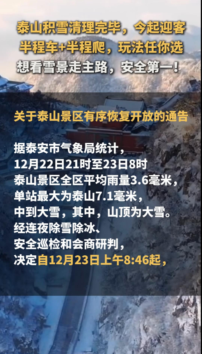 泰山积雪清理完毕,今起迎客!半程车+半程爬,玩法任你选,想看雪景走主路,安全第一!