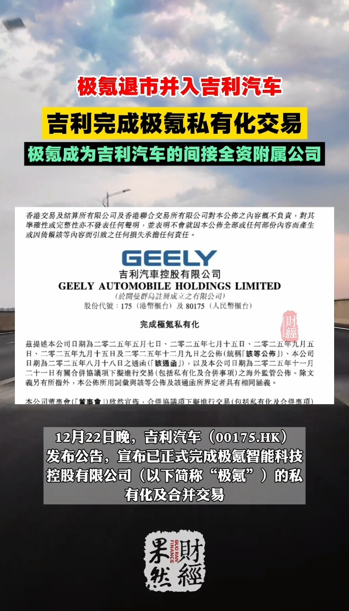 果然财经|极氪退市并入吉利汽车,成为其间接全资附属公司齐鲁晚报·齐鲁壹点客户端 14:12原创12月22日晚,吉利汽车(00175.HK)发布公告,宣布已正式完成极氪智能科技控股有限公司(以下简称“极氪”)的私有化及合并交易。至此,极氪成为吉利汽车的间接全资附属公司,并从纽交所退市,而今年5月吉利提出的收购极氪全部已发行股份、推动其私有化退市的计划,历经7个月正式落地,“一个吉利”战略进入收官阶段。