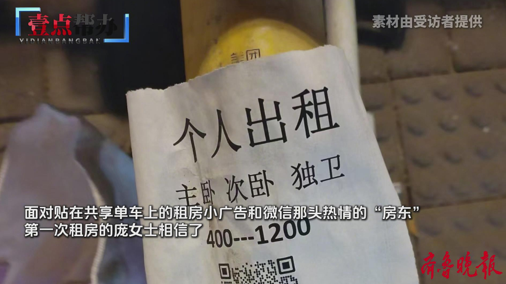 近日,济南壹粉庞女士向齐鲁晚报·齐鲁壹点(报料电话:0531-85193700;报料平台:“壹点帮办”微信小程序)反映称,今年10月,她在路边共享单车上看到一则租房小广告,联系上房东后对方承诺没中介费,随时能退。看完房双方约定每月租金1000元,押一付三。没想到入住当晚,她得知所谓“房东”实际是中介公司,且风评不好,她提出退租,结果被告知违约要赔200%的租金。(齐鲁晚报·齐鲁壹点 徐宁 王开智)