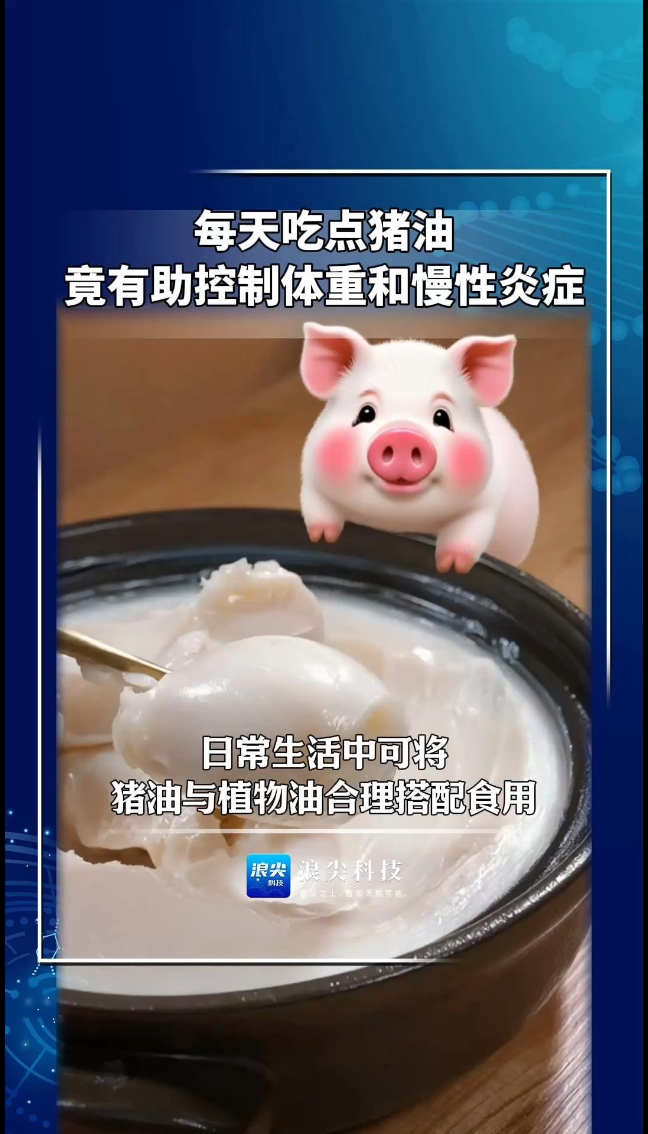 浪尖科技 |每天吃点猪油,竟有助控制体重和慢性炎症 09:20 浪尖科技 微信扫码扫码下载客户端湖南农业大学猪与人类健康科研团队发现,适量摄入猪油可减少脂肪沉积和脂肪炎症。研究人员建议,成年人每天烹饪用油量以25克至30克为宜,其中猪油的摄入量建议占一半左右。相关研究成果近日发表于《npj-食品科学》。