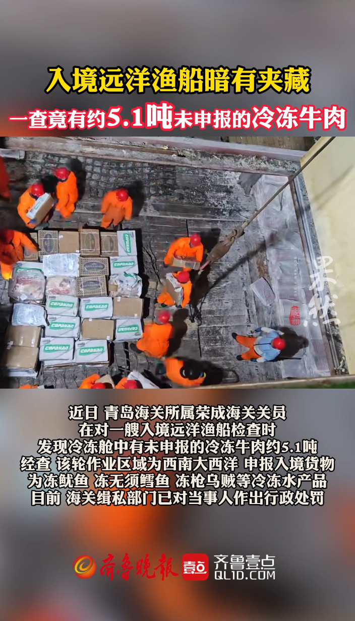 果然视频丨约5.1吨冷冻牛肉!远洋渔船暗有夹藏入境被查齐鲁晚报·齐鲁壹点客户端 昨天14:07原创近日,青岛海关所属荣成海关关员在对一艘入境远洋渔船检查时,发现冷冻舱中有未申报的冷冻牛肉约5.1吨。经查,该轮作业区域为西南大西洋,申报入境货物为冻鱿鱼、冻无须鳕鱼、冻枪乌贼等冷冻水产品。目前,海关缉私部门已对当事人作出行政处罚。 (齐鲁晚报·齐鲁壹点 李自强)