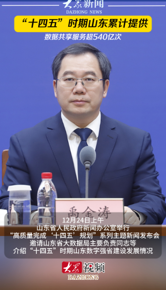 “十四五”时期山东累计提供数据共享服务超540亿次大众新闻 昨天14:54原创12月24日上午,山东省人民政府新闻办公室举行“高质量完成‘十四五’规划”系列主题新闻发布会,邀请山东省大数据局主要负责同志等介绍“十四五”时期山东数字强省建设发展情况。(大众新闻记者 高广超 程文琪 策划 马玉峰 陈巨慧)