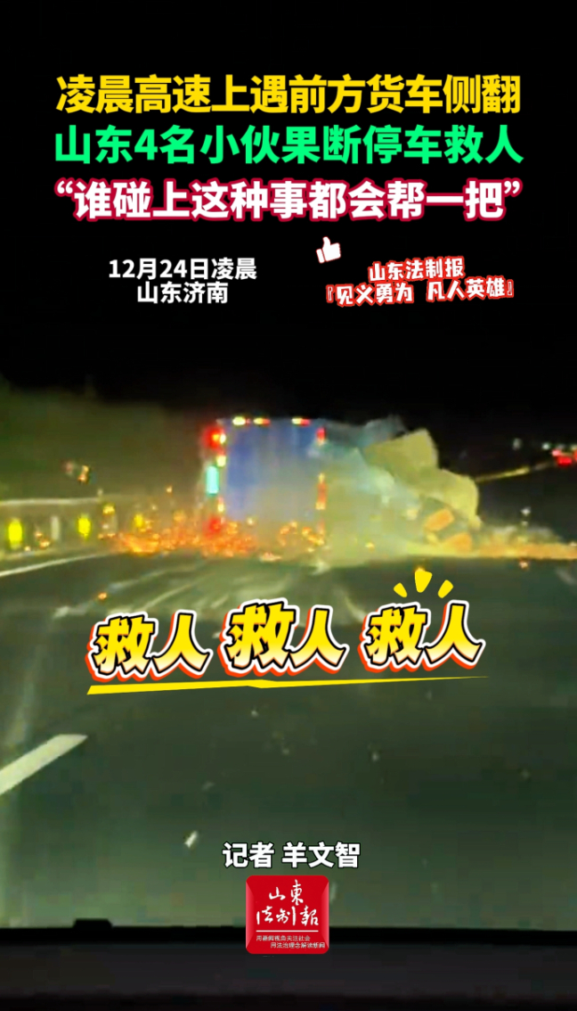 凌晨高速上遇前方货车侧翻,山东4名小伙果断停车救人,“谁碰上这种事都会帮一把” 昨天16:56 原创大众新闻·山东法制报 微信扫码扫码下载客户端12月24日凌晨,G2京沪高速济南章丘路段,一辆货车行驶中发生侧翻。后方车辆上的4名山东小伙发现险情后,当即停车靠边,果断下车救人,将货车司机安全救出,又帮忙捡拾了散落的苹果,随后才放心离开。 事后,救人者之一的田先生接受本报记者采访时说:“当时没想这么多,谁碰上这种事都会帮一把。”(大众新闻•山东法制报记者 羊文智)