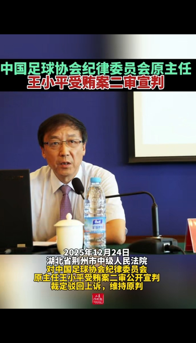 中国足球协会纪律委员会原主任王小平受贿案二审宣判 昨天16:56 新华社 微信扫码扫码下载客户端2025年12月24日,湖北省荆州市中级人民法院对中国足球协会纪律委员会原主任王小平受贿案二审公开宣判,裁定驳回上诉,维持原判。 据公开资料,2025年7月30日,湖北省松滋市人民法院以受贿罪判处被告人王小平有期徒刑10年6个月,并处罚金人民币70万元,2023年3月,王小平被查。2023年9月,王小平被移送检察机关。2025年4月,王小平因被控受贿罪在湖北省松滋市法院进行了一审。