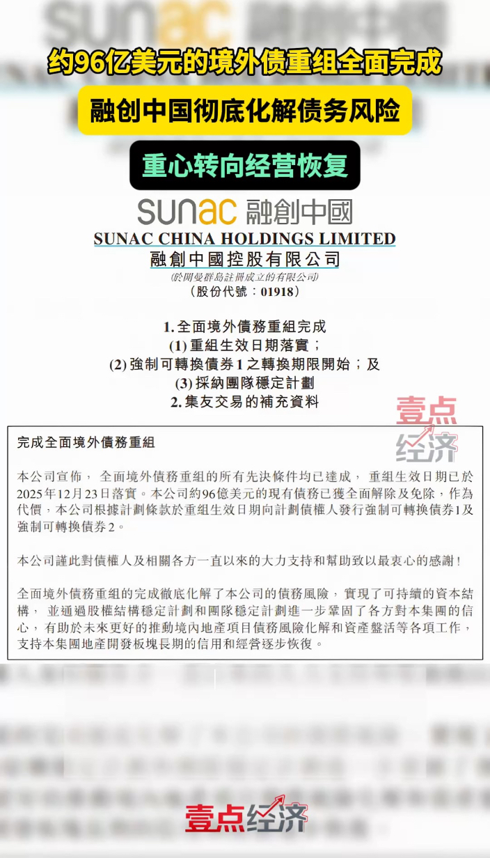 壹点企讯|融创中国:约96亿美元境外债务重组全面完成大众报业·齐鲁壹点 昨天16:1712月23日,融创中国在港交所公告,全面境外债务重组的所有先决条件均已达成,重组生效日期已于12月23日落实,公司约96亿美元的现有债务已获全面解除及免除。