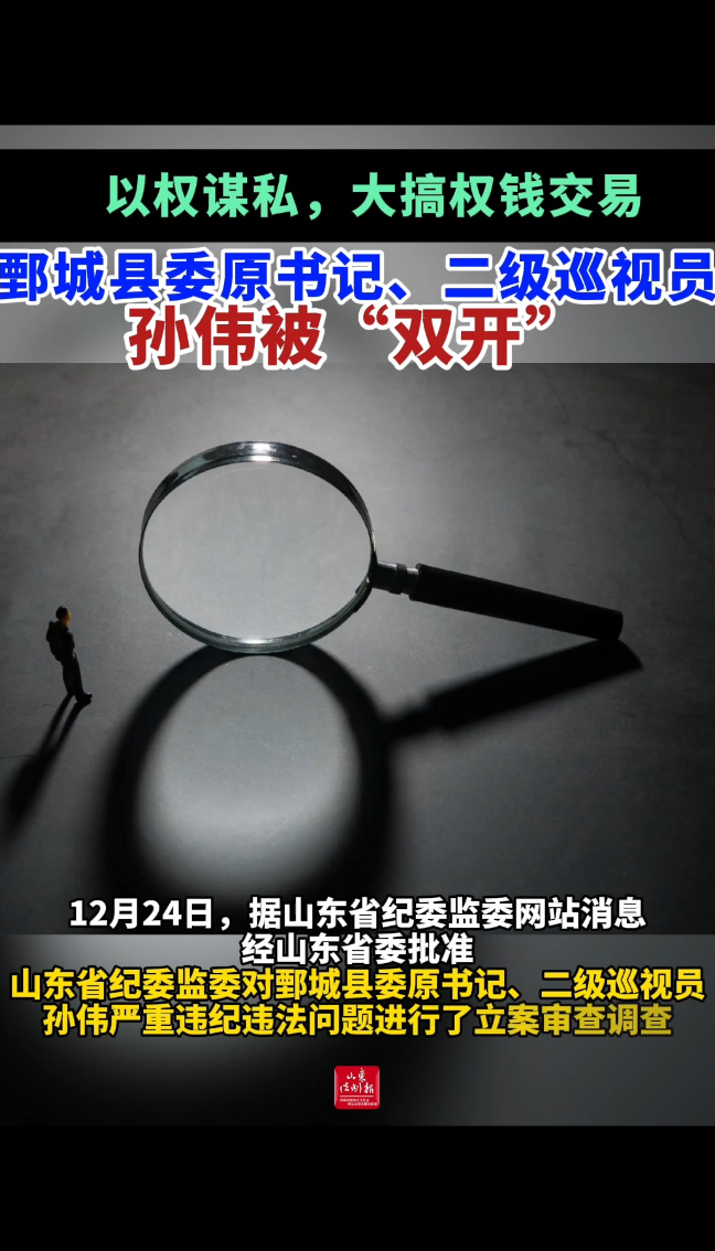 12月24日,据山东省纪委监委网站消息,经山东省委批准,山东省纪委监委对鄄城县委原书记、二级巡视员孙伟严重违纪违法问题进行了立案审查调查。