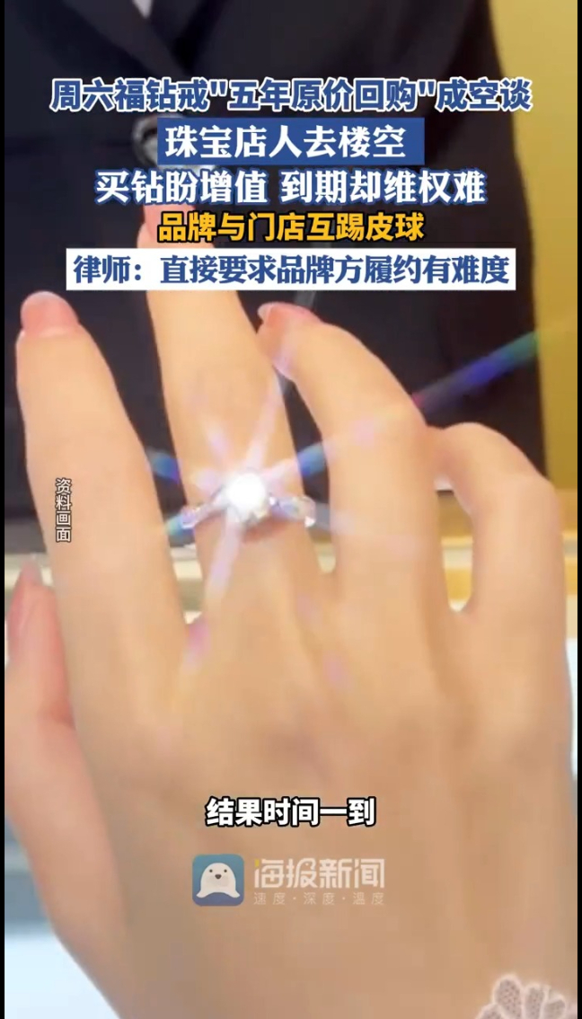 最近,长沙的谢女士就遇到了这糟心事。2020年,她在周六福珠宝店花两万多元买了枚钻戒,当时店家宣传“五年后原价回购”,吸引了好多人。可今年到期后,她发现店已倒闭,品牌方周六福总部却说:这是经销商门店的承诺,与公司无关。