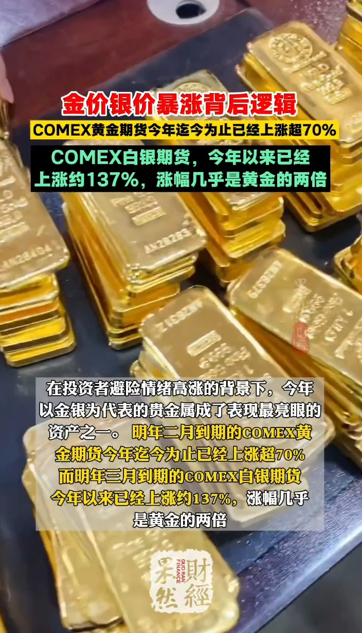 果然财经|黄金期货涨超70%,白银期货今年已上涨约137%齐鲁晚报·齐鲁壹点客户端 昨天17:23原创在投资者避险情绪高涨的背景下,今年以金银为代表的贵金属成了表现最亮眼的资产之一。 明年二月到期的COMEX黄金期货今年迄今为止已经上涨超70%。而明年三月到期的COMEX白银期货,今年以来已经上涨约137%,涨幅几乎是黄金的两倍。
