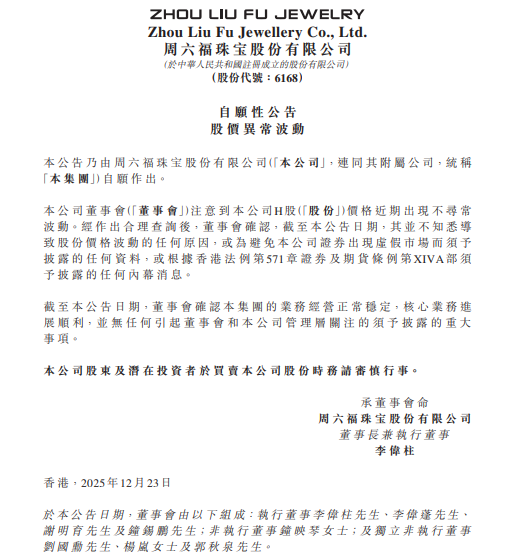 海报新闻记者在周六福官网注意到,其于12月23日发布公告称,该公司H股价格近期出现不寻常波动。