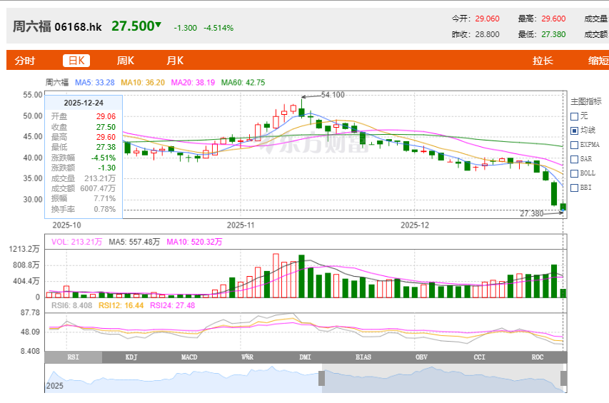 公开信息显示,周六福于6月26日在香港联合交易所挂牌上市。12月24日,记者在东方财富网查询获悉,当日周六福股价跌幅4.51%。至此,其股价已连续多个交易日收跌。