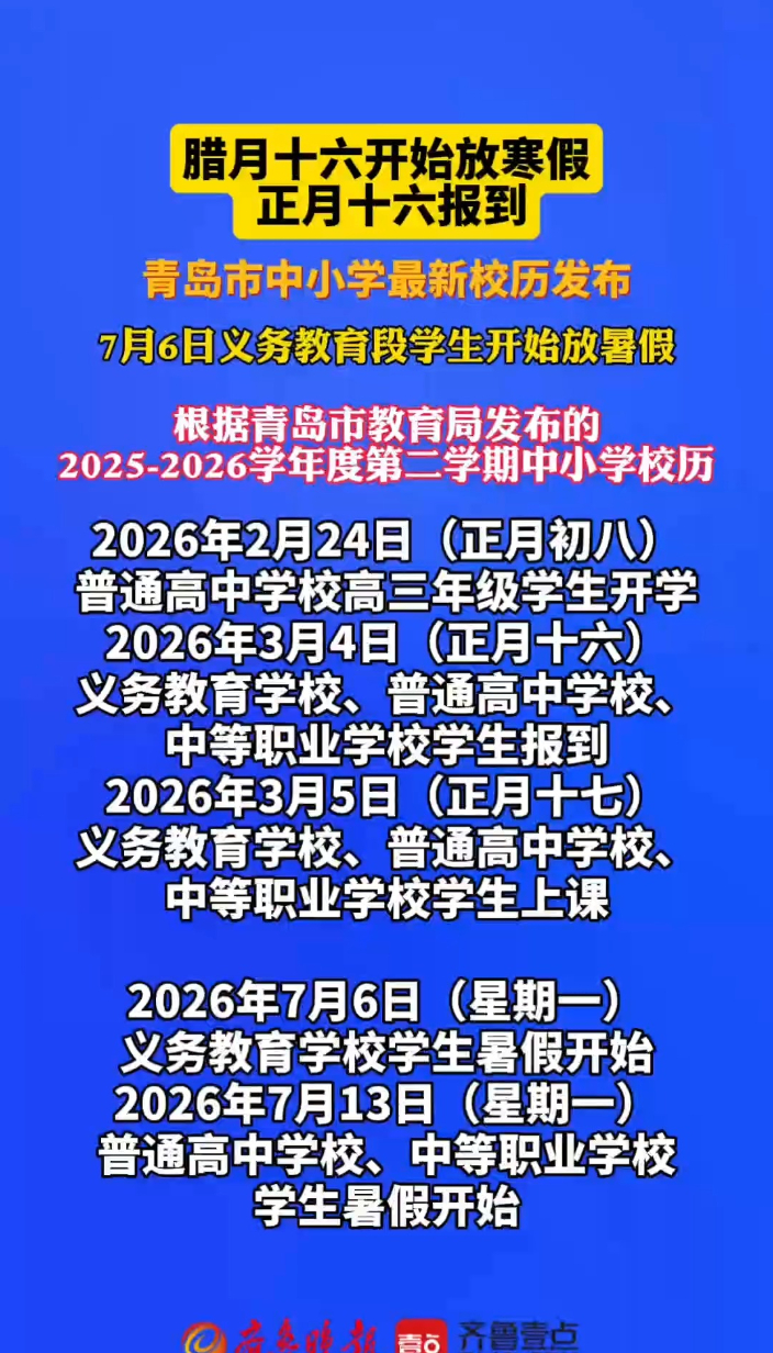 果然视频丨青岛中小学迎最短学期,仅18周齐鲁晚报·齐鲁壹点客户端 昨天19:43原创日前,青岛市教育局发布2025-2026学年度第二学期中小学校历。2026年3月5日(星期四)义务教育学校、普通高中学校、中等职业学校学生上课。2026年7月6日(星期一)义务教育学校学生暑假开始。如此算来,下学期,青岛中小学生将迎来最短学期,义务教育段仅有18周。 (齐鲁晚报·齐鲁壹点 李珍梅)