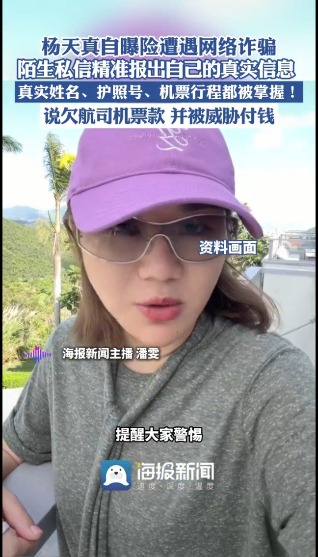 12月24日,杨天真在个人社交账号发布视频分享自己险些遭遇网络诈骗的经历。她称:“今天早上,我的社交媒体有几百万粉丝的大号收到一条私信,点出我的真实姓名、我的真实行程,说我欠他们航司机票款,若不付款就会用舆论和法律手段维权,甚至威胁要报警。”