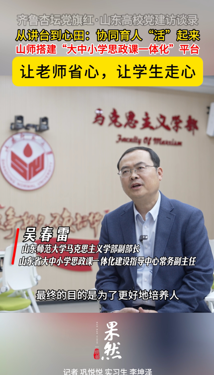(记者 巩悦悦 吝勇辉 吴圣男 实习生 吴在洁 李坤泽 济南报道)在山东省教育厅(省委教育工委)、山东数字文化集团的指导下,齐鲁晚报·齐鲁壹点推出“齐鲁杏坛党旗红·山东高校党建访谈录”系列报道,挖掘特色亮点,搭建交流平台,为全省高校“一融双高”建设提供具像化参考、常态化样板和示范性引领。首期山东高校党建访谈走进山东师范大学,一起来了解马克思主义学部党员老师搭建的“大中小学思政课一体化”平台。