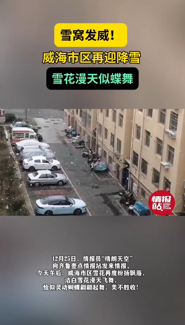天气情报站|雪窝发威!威海市区再迎降雪,雪花漫天似蝶舞 13:38 大众报业·齐鲁壹点 微信扫码扫码下载客户端12月25日,情报员“晴朗天空”向齐鲁壹点情报站发来情报。今天午后,威海市区雪花再度纷扬飘落,洁白雪花漫天飞舞,恰似灵动蝴蝶翩翩起舞,美不胜收!据山东省气象台消息,25日白天,烟台北部和威海天气多云间阴有小雪局部中雪,其他地区天气晴到少云。