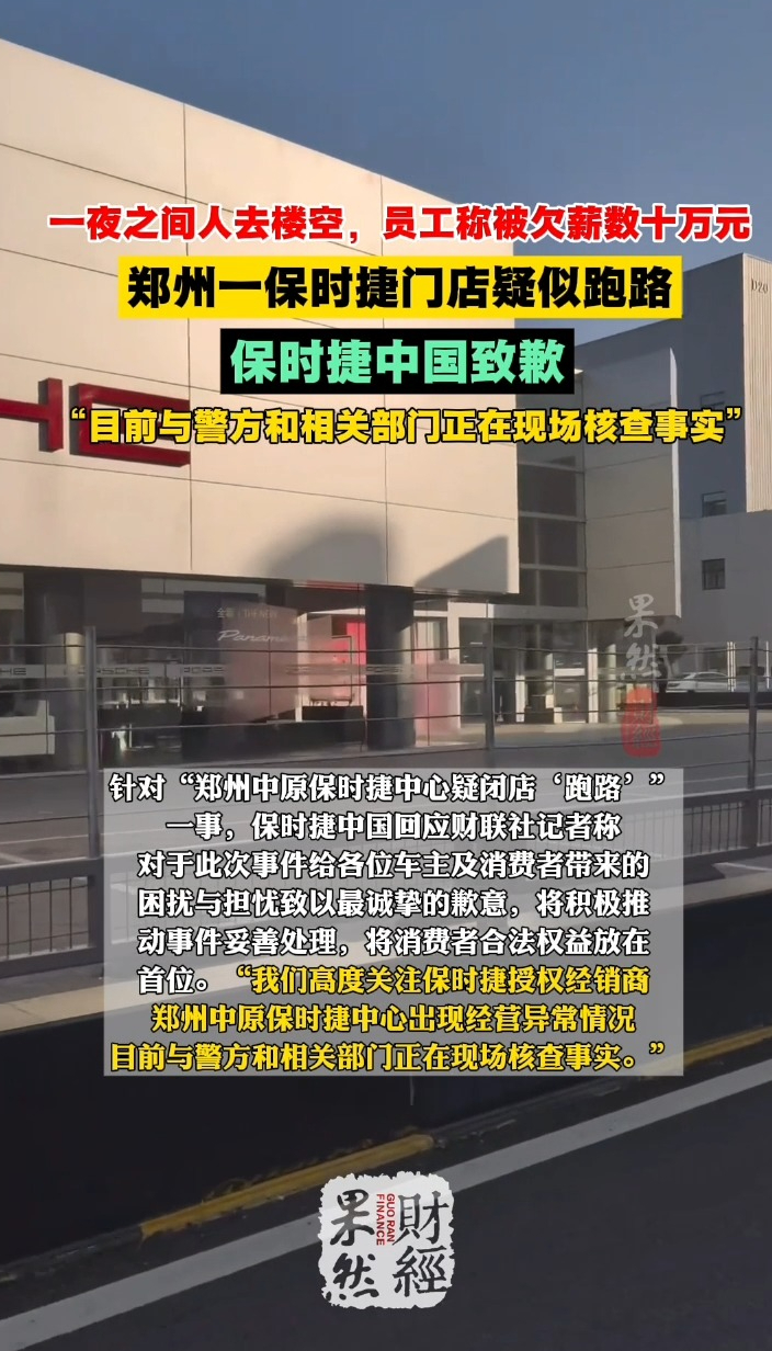 果然财经|郑州一保时捷门店疑似跑路,保时捷中国致歉齐鲁晚报·齐鲁壹点客户端 15:07原创针对“郑州中原保时捷中心疑闭店‘跑路’”一事,保时捷中国回应财联社记者称,对于此次事件给各位车主及消费者带来的困扰与担忧致以最诚挚的歉意,将积极推动事件妥善处理,将消费者合法权益放在首位。“我们高度关注保时捷授权经销商郑州中原保时捷中心出现经营异常情况,目前与警方和相关部门正在现场核查事实。”