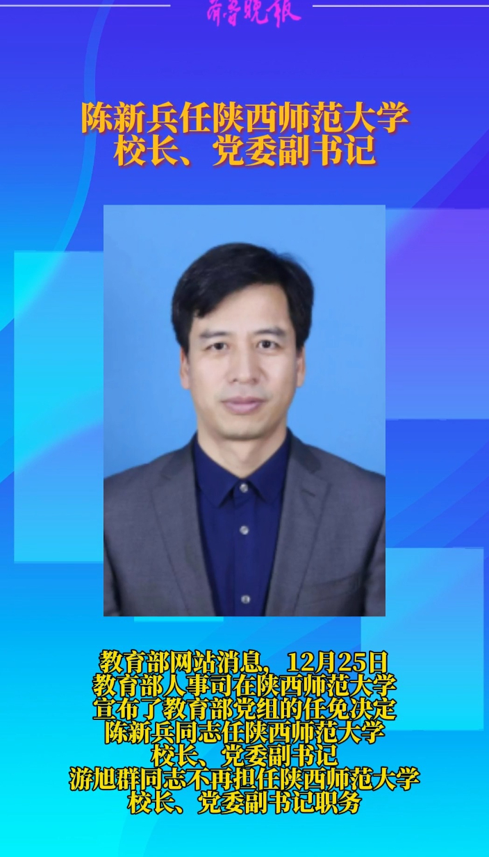 观政视频|陈新兵任陕西师范大学校长、党委副书记 15:16 原创齐鲁晚报·齐鲁壹点客户端 微信扫码扫码下载客户端(齐鲁晚报·齐鲁壹点记者 范佳)教育部网站消息,12月25日,教育部人事司在陕西师范大学宣布了教育部党组的任免决定,陈新兵同志任陕西师范大学校长、党委副书记,游旭群同志不再担任陕西师范大学校长、党委副书记职务。