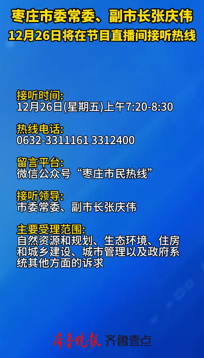 枣庄市委常委、副市长张庆伟12月26日将在节目直播间接听热线