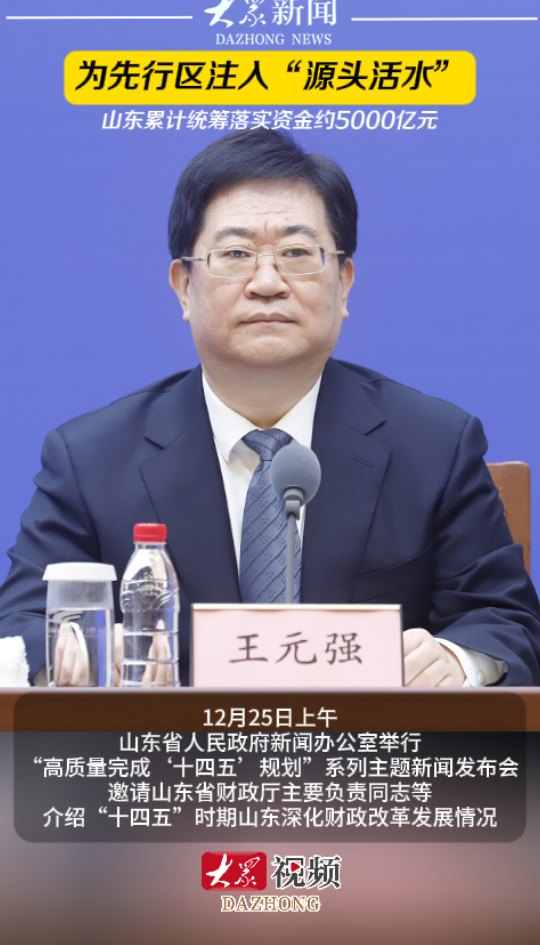为先行区注入“源头活水”,山东累计统筹落实资金约5000亿元大众新闻 17:58原创12月25日上午,山东省人民政府新闻办公室举行“高质量完成‘十四五’规划”系列主题新闻发布会,邀请山东省财政厅主要负责同志等介绍“十四五”时期山东深化财政改革发展情况。(大众新闻记者 高广超 杨烨莹 策划 马玉峰 陈巨慧)