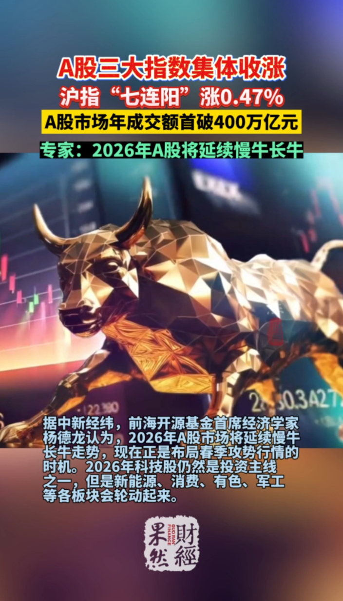 果然财经|沪指七连阳!3700只股上涨,春季攻势窗口期已到?齐鲁晚报·齐鲁壹点客户端 18:08原创综合消息,A 股三大指数集体收涨,沪指低开高走斩获七连阳,深成指、创业板指探底回升同步收红,收盘沪指涨 0.47%、深成指涨 0.33%、创业板指涨 0.3%。盘面热点快速轮动,全市场超 3700 只个股飘红,93 只个股涨停,赚钱效应凸显。2025 年沪指曾突破 4000 点关口,前海开源基金杨德龙研判,2026 年 A 股将延续慢牛长牛,当前正是布局春季攻势的最佳窗口期。