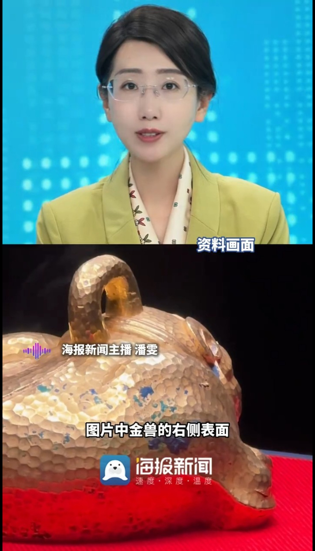 “99%纯金咋掉色了?”南博镇馆之宝西汉金兽遭质疑,图片中,金兽的右侧表面有黑色物质,疑似掉色。