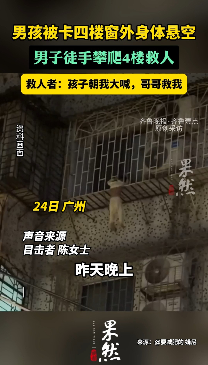 果然视频|男孩被卡四楼窗外身体悬空,男子徒手爬楼救人齐鲁晚报·齐鲁壹点客户端 18:14原创12月24日晚七点多,广州一居民区里,一男童头部被防护窗卡住,身体悬挂在窗外。在网友分享的视频里可以看到,一名白衣男子徒手攀上四楼将男童推进屋内,两名男子在男童悬挂下方预备随时保护,防止男童突然坠落。白衣男子的朋友陈女士告诉齐鲁晚报·齐鲁壹点记者,“当时他接住孩子的时候,孩子还对他说‘哥哥救我’。”(齐鲁晚报·齐鲁壹点 郭辰昊 实习生 李怡静)