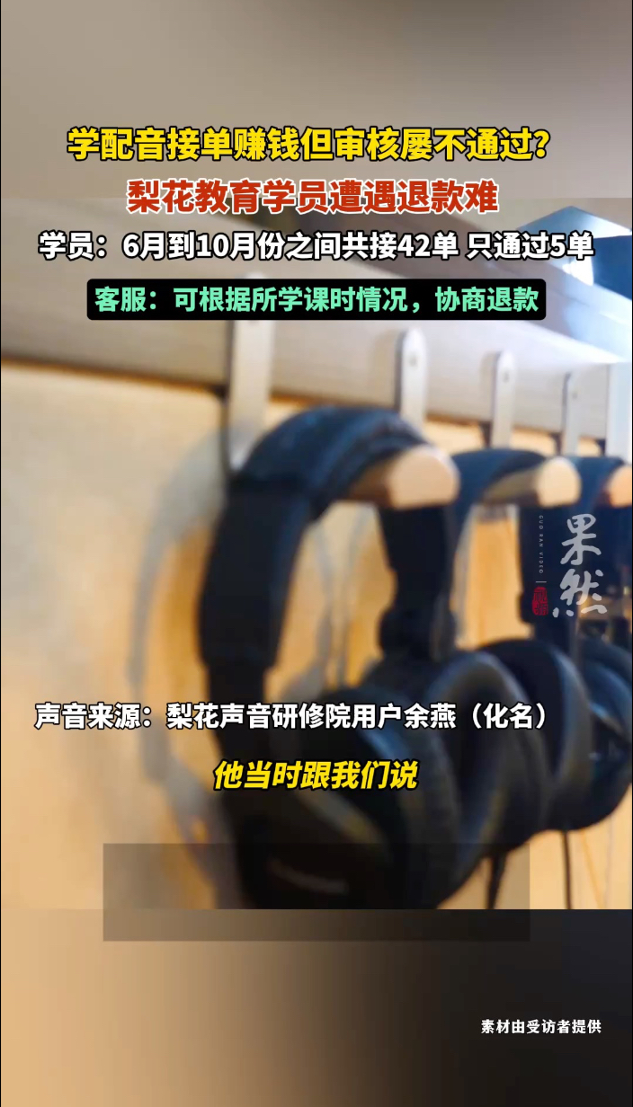 果然视频|学配音接单赚钱但审核屡不通过?梨花教育学员退款难 齐鲁晚报·齐鲁壹点客户端 18:12原创近日,多位梨花教育的学员向齐鲁晚报·齐鲁壹点反映,他们在梨花声音研修院缴纳数万元报名配音课程、购置录音设备后,接单审核屡屡碰壁,后续退款也陷入困难,希望能够妥善解决问题。对此,梨花声音研修院客服解释,若想要退款,可根据所学课时情况,协商退款;针对反映接单难问题,则需要用户本人反馈给负责老师。 (齐鲁晚报·齐鲁壹点记者 路董萌 胡玲玲 实习生 高晓灿)