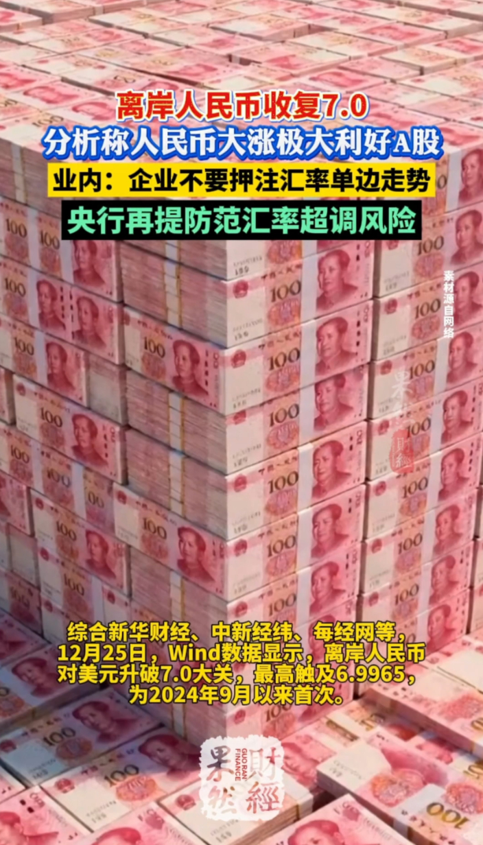 果然财经|离岸人民币收复7.0,分析称将极大利好A股齐鲁晚报·齐鲁壹点客户端 18:20原创综合消息,12月25日,Wind数据显示,离岸人民币对美元升破7.0大关,最高触及6.9965,为2024年9月以来首次。在中国银河证券首席策略分析师杨超看来,人民币汇率持续稳步升值,极大利好A股市场走势,人民币资产估值提升预期较强。