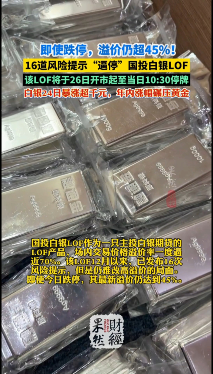 12 月 25 日,国投白银 LOF (LOF:上市型开放式基金)在三连涨停后开盘即封死跌停。近期白银价格大涨,这只主投白银期货的 LOF 成资金焦点,场内价格溢价率一度逼近 70%。该基金 12 月已连发 16 次风险提示却难遏高溢价,即便跌停后溢价仍达 45%,当日收盘价 2.804 元远超基金净值。基金公告提示盲目投资或面临大额损失,将于 12 月 26 日开市至 10:30 停牌。