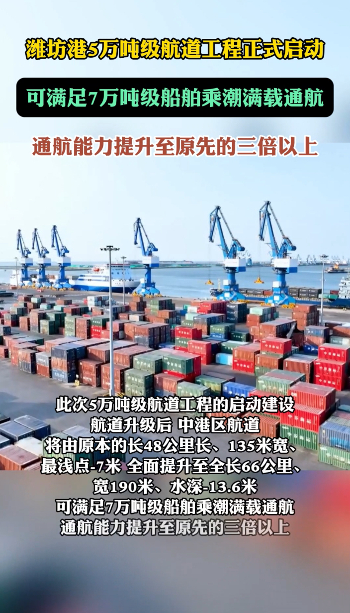 果然视频|通航能力提升至三倍以上,潍坊港5万吨航道工程启动大众报业·齐鲁壹点 昨天23:3112月25日,潍坊港国际物流大通道建设暨5万吨级航道工程启动活动在潍坊港中港区举行。据了解,航道升级后,中港区航道将由原本的长48公里长、135米宽、最浅点-7米,全面提升至全长66公里、宽190米、水深-13.6米,可满足7万吨级船舶乘潮满载通航,通航能力提升至原先的三倍以上。 齐鲁晚报·齐鲁壹点 吴昊