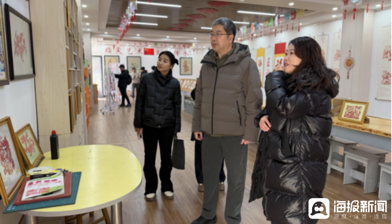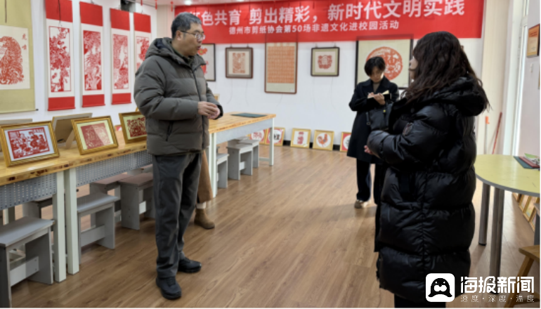在学校剪纸展览馆。馆内“红色共育 剪出精彩 新时代文明实践”的标语鲜明夺目,传递着将传统文化与时代精神相融合的办学匠心。王德胜主任兴致盎然地欣赏了学生们的剪纸作品,对其精巧技艺与创意表达给予高度评价。交流中,他进一步为学校剪纸特色发展提出新颖构想,建议增设“剪证德州”主题板块,通过剪纸艺术再现德州的历史文脉、风土人情、特色美食与具有时代印记的老物件,让剪纸成为传承地方文化、厚植家国情怀的生动载体。也为后续校本文化的深度拓展打开了新的思路。