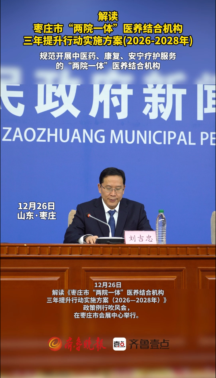 枣庄将开展中医药、康复等服务的“两院一体”医养结合机构齐鲁晚报·齐鲁壹点客户端 15:36原创12月26日,解读《枣庄市“两院一体”医养结合机构三年提升行动实施方案(2026—2028年)》政策例行吹风会,在枣庄市会展中心举行。