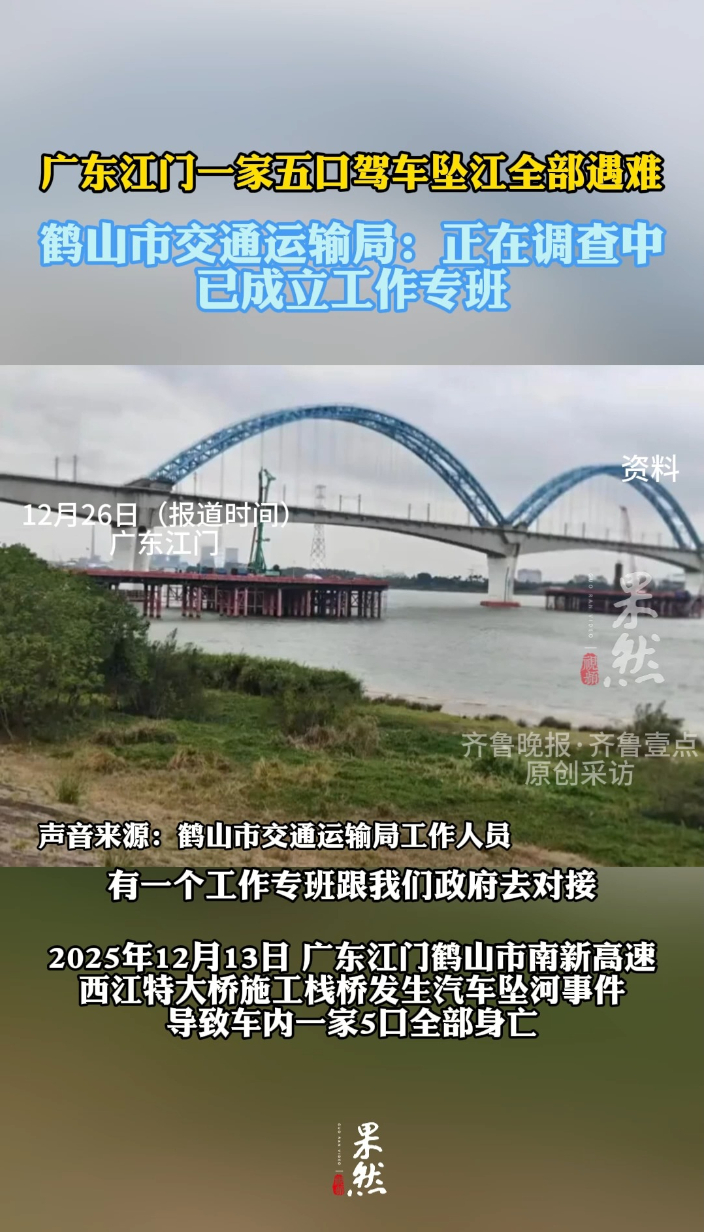 12月13日,广东江门鹤山市一施工栈桥有汽车坠河,车内一家5口全部身亡。26日,鹤山市交通运输局工作人员告诉记者,已经成立工作专班。鹤山市古劳镇党群服务中心工作人员表示,详细情况需联系鹤山市委宣传部。记者多次致电鹤山市委宣传部,截至发稿前均无人接听。(齐鲁晚报·齐鲁壹点爆料电话:0531-85193656;邮箱:405617016@qq.com)(齐鲁晚报·齐鲁壹点 刘志坤 实习生 高文珊)