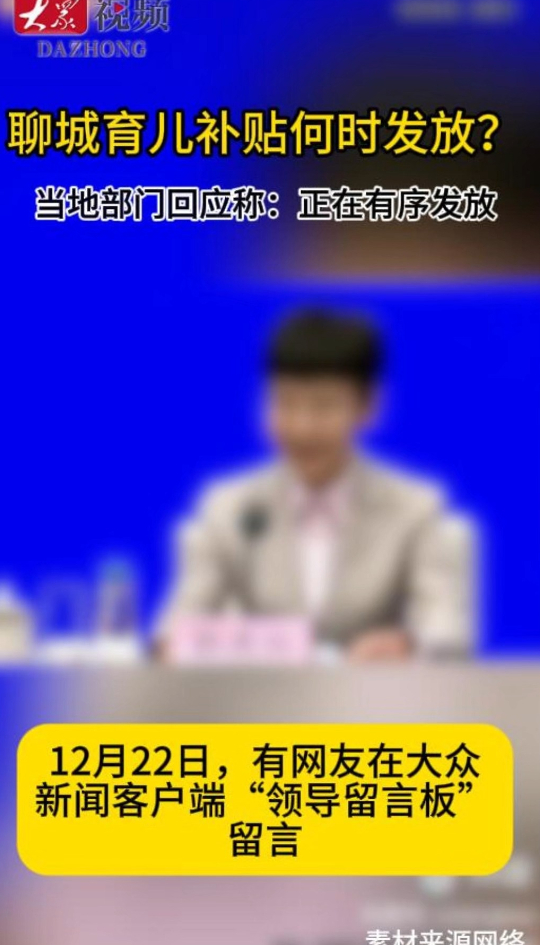 12月22日,网友@众友00179在大众新闻客户端“领导留言板”留言:“聊城啥时候能发放育儿补贴?”