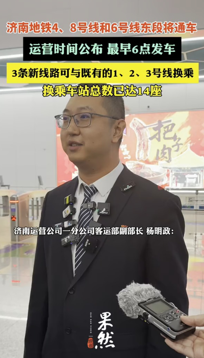 济南地铁4、8、6号线东段将通车,3条新线路可与1、2、3号线换乘大众报业·齐鲁壹点 16:41济南地铁4、8、6号线东段将通车,3条新线路可与既有的1、2、3号线换乘。运营时间公布,最早6点发车。 (齐鲁晚报·齐鲁壹点)