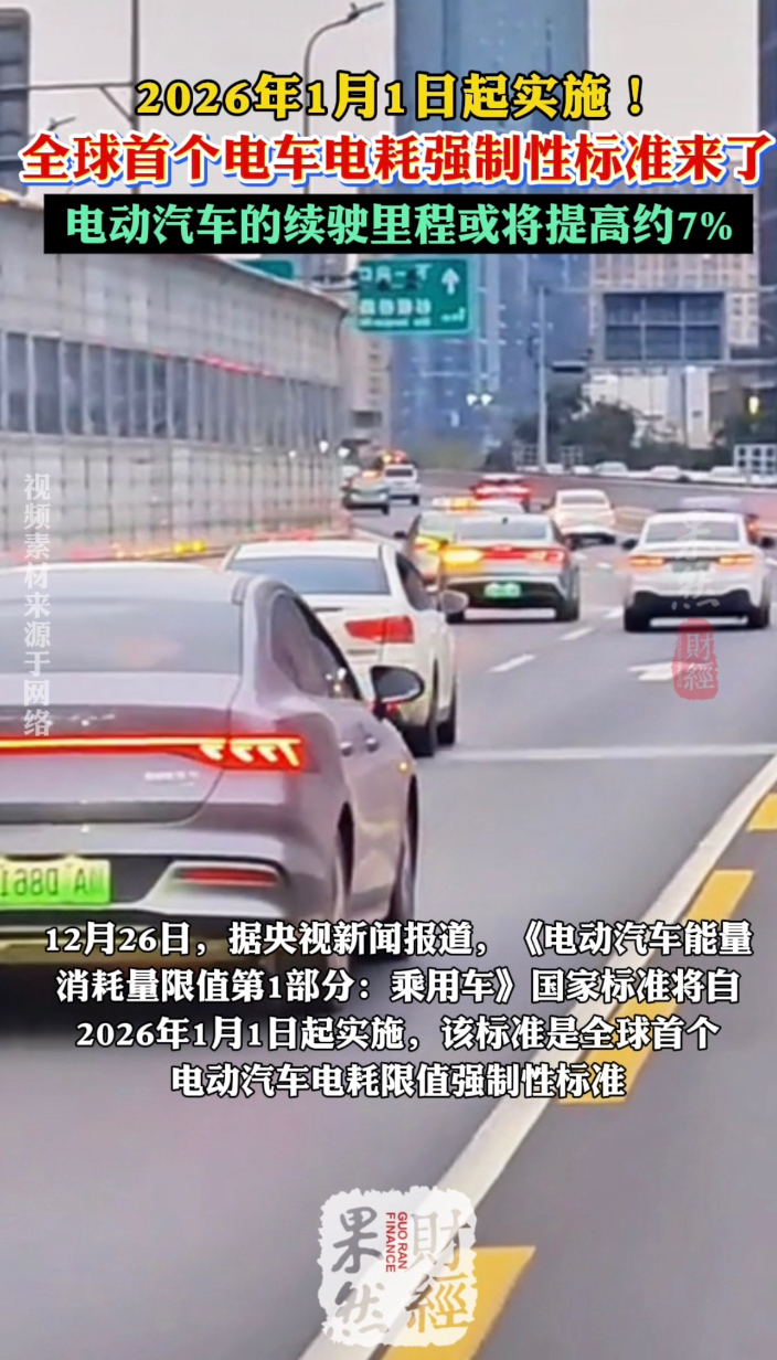 果然财经|明年起实施!全球首个电车电耗强制性标准来了齐鲁晚报·齐鲁壹点客户端 16:35原创12月26日,据央视新闻报道,《电动汽车能量消耗量限值第1部分:乘用车》国家标准将自2026年1月1日起实施,该标准是全球首个电动汽车电耗限值强制性标准。