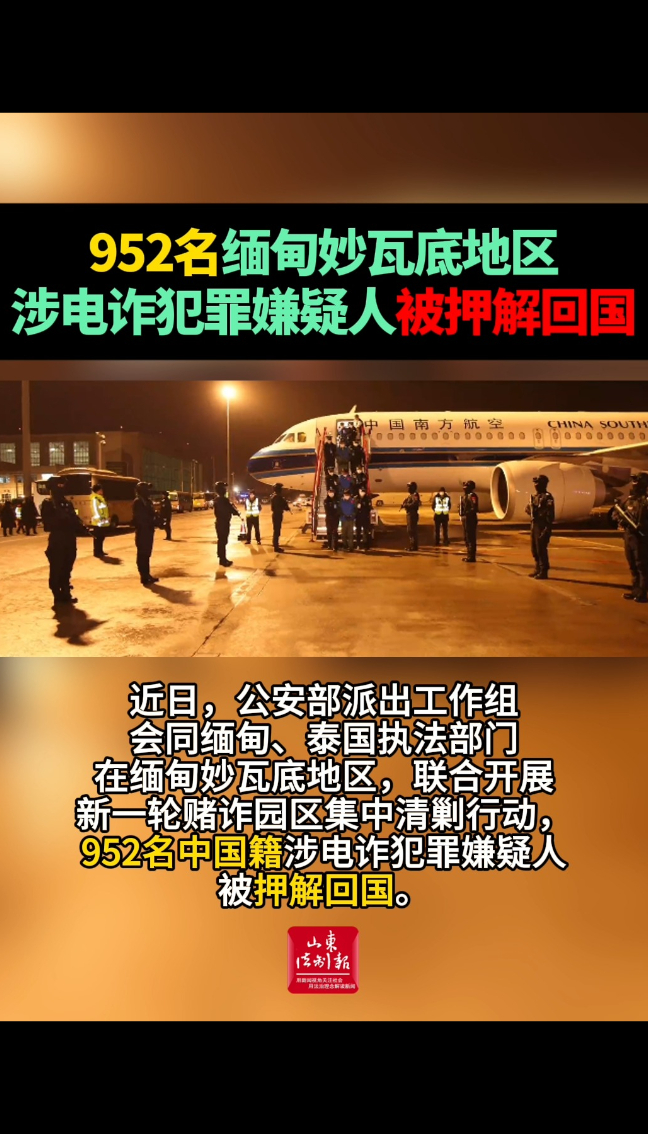 近日,公安部派出工作组会同缅甸、泰国执法部门在缅甸妙瓦底地区,联合开展新一轮赌诈园区集中清剿行动,952名中国籍涉电诈犯罪嫌疑人被押解回国。
